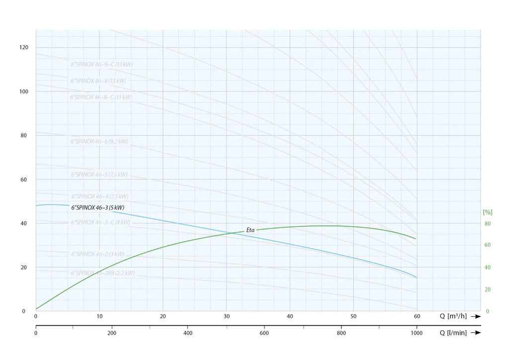 Pompa głębinowa 6" SPINOX 46-3 IBO ITALY charakteryzuje się prostym montażem i intuicyjną obsługą. Możliwość podpięcia przewodu elektrycznego o dowolnej długości (będącej wielokrotnością 5 metrów) znacznie ułatwia instalację w różnych warunkach. Dodatkowo, pompa jest przystosowana do pracy ciągłej, co gwarantuje niezawodność i minimalizuje potrzebę częstych interwencji serwisowych.Parametry Techniczne