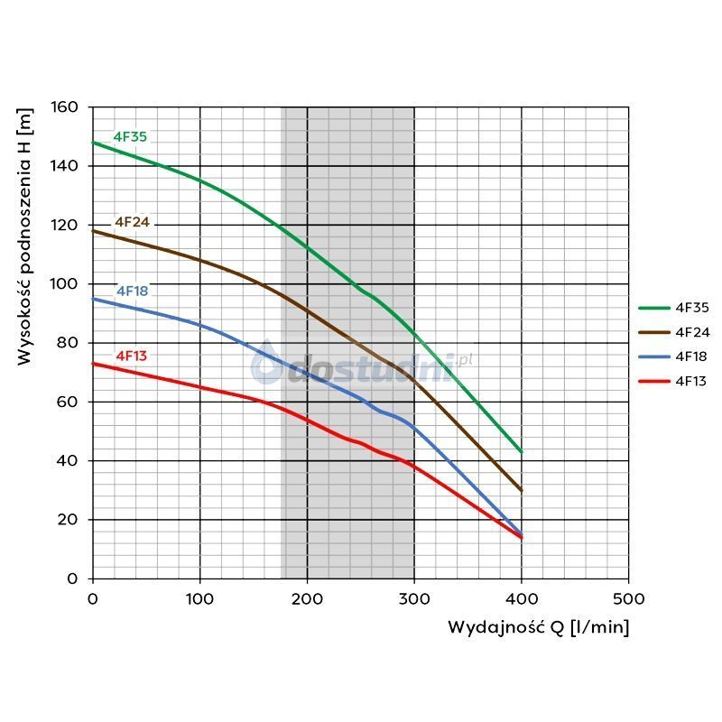 Pompa 4F24 Belgiardino charakteryzuje się dużą wydajnością i wysokością podnoszenia, co sprawia, że jest idealna do szerokiego spektrum zastosowań. Może pracować w pozycji pionowej, a jej maksymalna głębokość zanurzenia wynosi aż 150 metrów. Z mocą silnika 5,5 kW, pompa osiąga maksymalną wydajność 400 litrów na minutę i podnosi wodę na wysokość do 118 metrów. To doskonałe rozwiązanie do nawadniania ogrodów, zasilania budynków mieszkalnych, systemów przemysłowych i stawów hodowlanych.