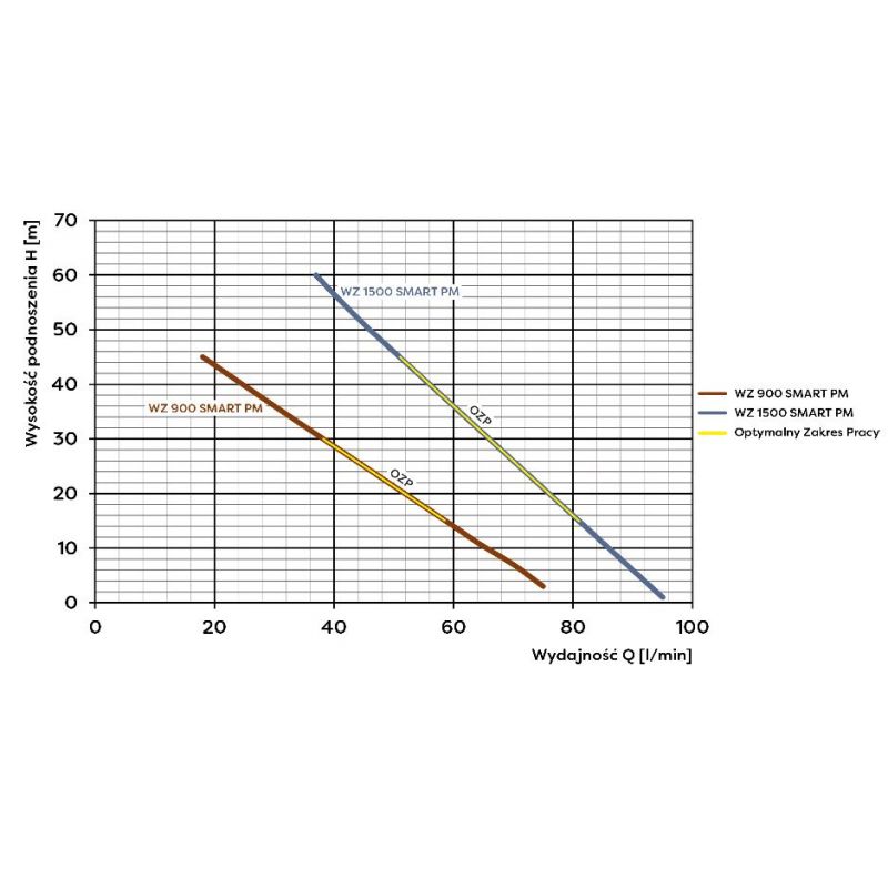 Pompa WZ1500 Smart charakteryzuje się następującymi parametrami: wydajność maksymalna 95 l/min, wysokość podnoszenia maksymalna 60 m, ciśnienie maksymalne 6 bar, maksymalna głębokość ssania 7 m, napięcie 230 V, natężenie prądu 6,5 A, moc silnika 1,5 kW. Króćce ssący i tłoczny mają średnicę DN40 (1½"). Wirniki wykonane są z mosiądzu. Waga pompy to 12,5 kg. Te imponujące parametry gwarantują wydajną i niezawodną pracę w różnorodnych warunkach.