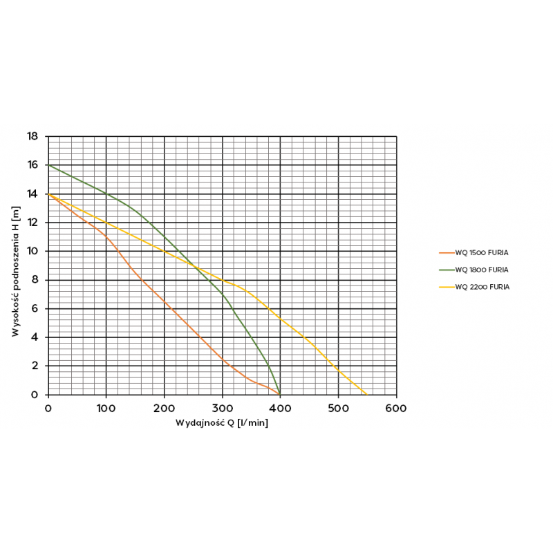 Pompa WQ Furia 2200 charakteryzuje się wysoką wydajnością, osiągając maksymalny przepływ na poziomie 700 l/min. Jej maksymalna wysokość podnoszenia to aż 17 metrów, co sprawia, że doskonale sprawdza się nawet z długimi wężami, np. o długości 100 metrów. Dzięki temu pompa jest w stanie efektywnie transportować wodę na duże odległości i pokonywać znaczne różnice wysokości.