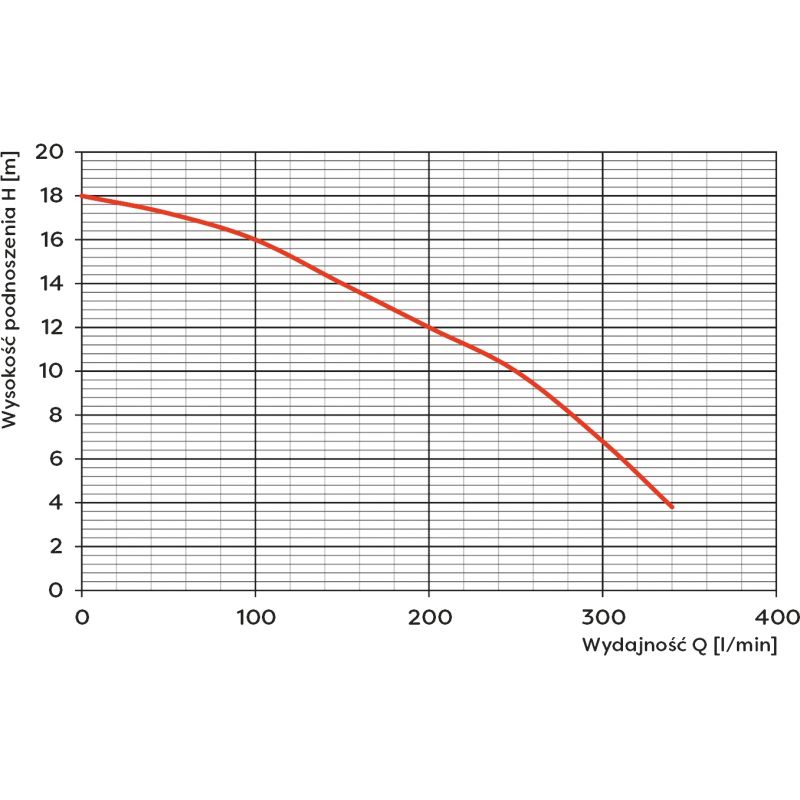 Urządzenie charakteryzuje się imponującą wydajnością – maksymalnie 340 l/min (20,4 m3/h). Pozwala to na szybkie i efektywne usuwanie wody. Pompa posiada również znaczną wysokość podnoszenia, wynoszącą 18 metrów, co umożliwia tłoczenie cieczy na znaczne odległości lub pokonywanie różnic poziomów. Ciśnienie maksymalne wynosi 1,8 bara, co zapewnia stabilną pracę nawet przy większym obciążeniu.