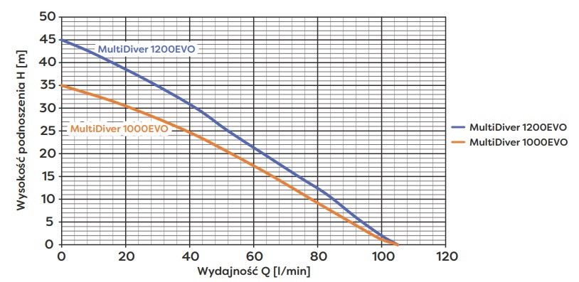 Pompa Multi Diver 1000 EVO wyposażona jest w mocny silnik o mocy 0,85 kW, który zapewnia imponującą wydajność. Maksymalny przepływ wody wynosi aż 105 litrów na minutę, a wysokość podnoszenia sięga 35 metrów. To sprawia, że pompa doskonale nadaje się do zasilania systemów nawadniających, doprowadzania wody do domu, czy też jako element hydroforu. Solidne parametry techniczne gwarantują efektywną pracę i oszczędność energii.