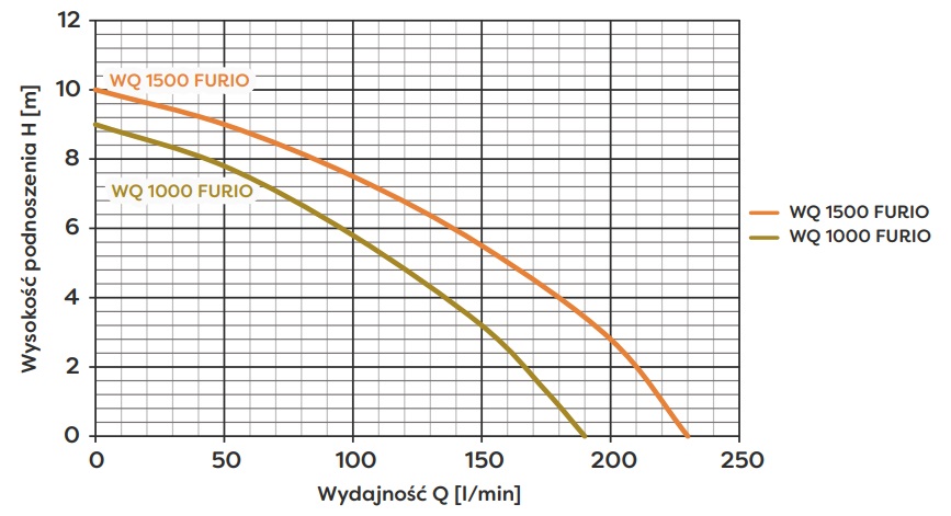 Pompa WQ 1500 Furio charakteryzuje się wysoką wydajnością oraz optymalnymi parametrami technicznymi. Maksymalna wydajność urządzenia to 230 litrów na minutę, a wysokość podnoszenia sięga do 10 metrów. Silnik o mocy 1100W zapewnia efektywne działanie, a zasilanie 230V sprawia, że pompa jest kompatybilna z większością instalacji elektrycznych. Długi, 6-metrowy kabel zasilający umożliwia swobodne podłączenie urządzenia w różnych lokalizacjach.