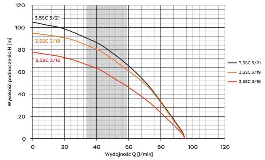 Pompa głębinowa 3,5 SC 3/16 charakteryzuje się imponującą wydajnością – osiąga maksymalny przepływ do 95 litrów na minutę (5.7 m3/h) oraz ciśnienie do 7.8 bar. Maksymalna wysokość podnoszenia wynosi 78 metrów, co pozwala na efektywne pompowanie wody nawet z bardzo głębokich ujęć. Mocny silnik o mocy 750W (0.75 kW) zapewnia niezawodne działanie i efektywne zużycie energii. Średnica pompy to 3.5 cala, a minimalna średnica odwiertu to 4 cale (100mm). Rozmiar króćca tłocznego wynosi 1 1/2 cala.
