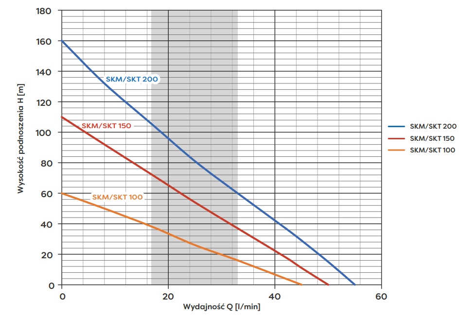 Pompa głębinowa SKM200 charakteryzuje się imponującymi parametrami: wydajność maksymalna 55 l/min, wysokość podnoszenia do 160 metrów, oraz ciśnienie maksymalne 16 barów. Dzięki temu bez problemu poradzi sobie z zasilaniem nawet rozległych systemów nawadniania lub kilku punktów poboru wody jednocześnie. Mocny silnik o mocy 1,5 kW zapewnia niezawodną pracę przez długie lata. Parametry pompy zadowolą nawet najbardziej wymagających użytkowników. Waga zestawu to około 18 kg. Średnica pompy to 100mm. Minimalna średnica odwiertu to 4". Rozmiar króćca tłocznego: DN25 (1").